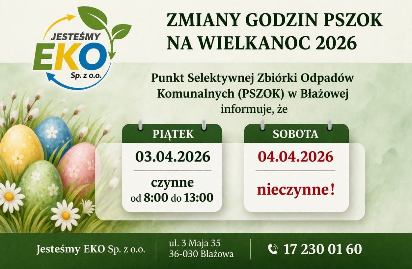 Informacja o godzinach otwarcia PSZOK – Wielkanoc 2026 Informacja o godzinach otwarcia PSZOK – Wielkanoc 2026 By Paweł Trojanowski|2026-03-31T12:07:35+02:0028 marca 07:39, 2026|Aktualności| Udostępnij FacebookX Podobne wpisy Życzenia Wielkanocne Gallery Życzenia Wielkanocne 1 kwietnia 17:50, 2026 Harmonogram odbioru odpadów komunalnych w 2026 roku Gallery Harmonogram odbioru odpadów komunalnych w 2026 roku 15 lutego 10:27, 2026 Harmonogram odbioru odpadów komunalnych na luty 2026 roku Gallery Harmonogram odbioru odpadów komunalnych na luty 2026 roku 23 stycznia 10:30, 2026
